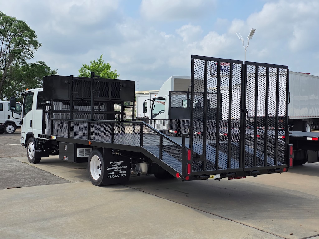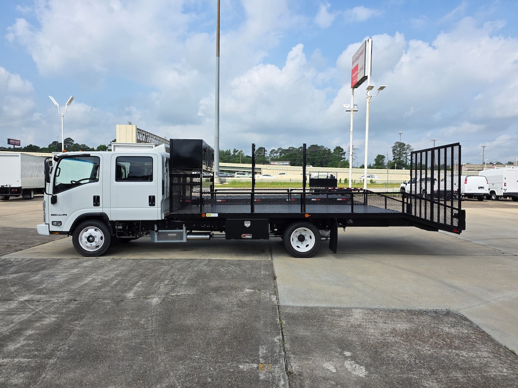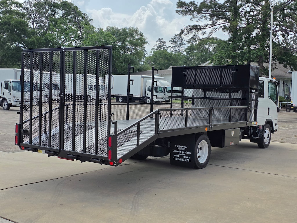 2025 Isuzu NPR-HD Crew Cab cab chassis 176 wheel base 6.6ltr GM engine, 16FT Landscape flatbed with 4ft dove tail and ramps, edger racks and hand tool rack water cooler and tie down rings, power windows and locks and AM/FM CD radio and Bluetooth compatible.
